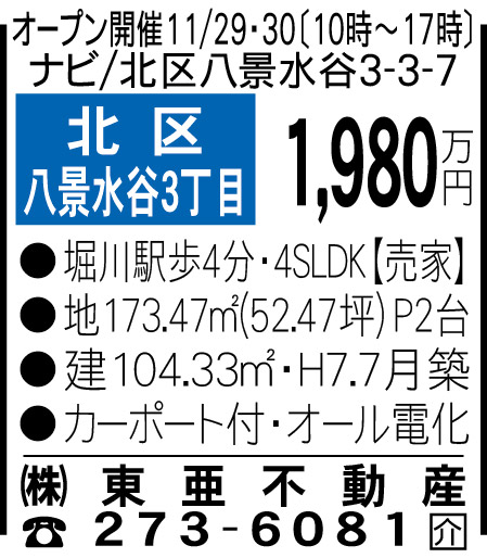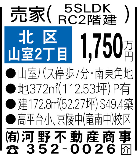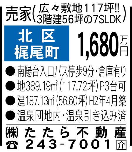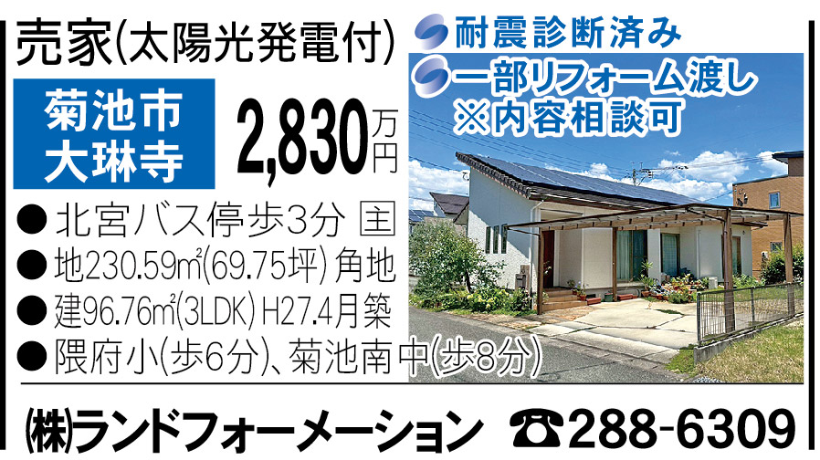 ・東区画図町重富[3289万円] ・南区白藤1丁目[1100万円] ・北区兎谷1丁目[2780万円] ・北区山室2丁目[1750万円] ・北区八景水谷3丁目[1980万円]オープンハウス開催 ・北区池田3丁目[1150万円] ・北区梶尾町[1680万円] ・合志市豊岡[1380万円]オープンハウス開催 ・合志市須屋[1200万円] ・菊池市泗水町永[700万円] ・菊池市大琳寺[2830万円] ・上益城郡山都町下馬尾[500万円]
